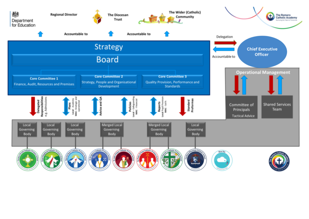The Romero Catholic Academy came into existence on 1st August 2015. The Engagement Model above shows the Governance structure of the Romero Catholic Academy and how the Board of Directors, Principals Committee and the Governing Body relate to each other.